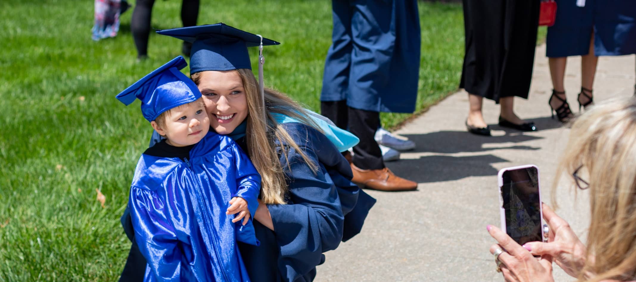 Historical image of two female students walking through the arched stone entryway of a main campus building. Graduate in full regalia, kneeling next to her young son - also in rull regalia - at Commencement.