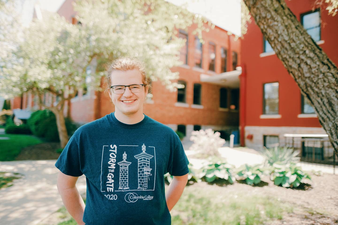 International: Student wearing glasses and a Storm the Gate 2020 t-shirt.
