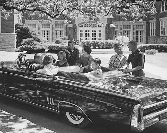Historical image of Columbia College students gathering in and around an old convertible car. Proud smiling faces of graduates in full regalia at the commencement ceremony.