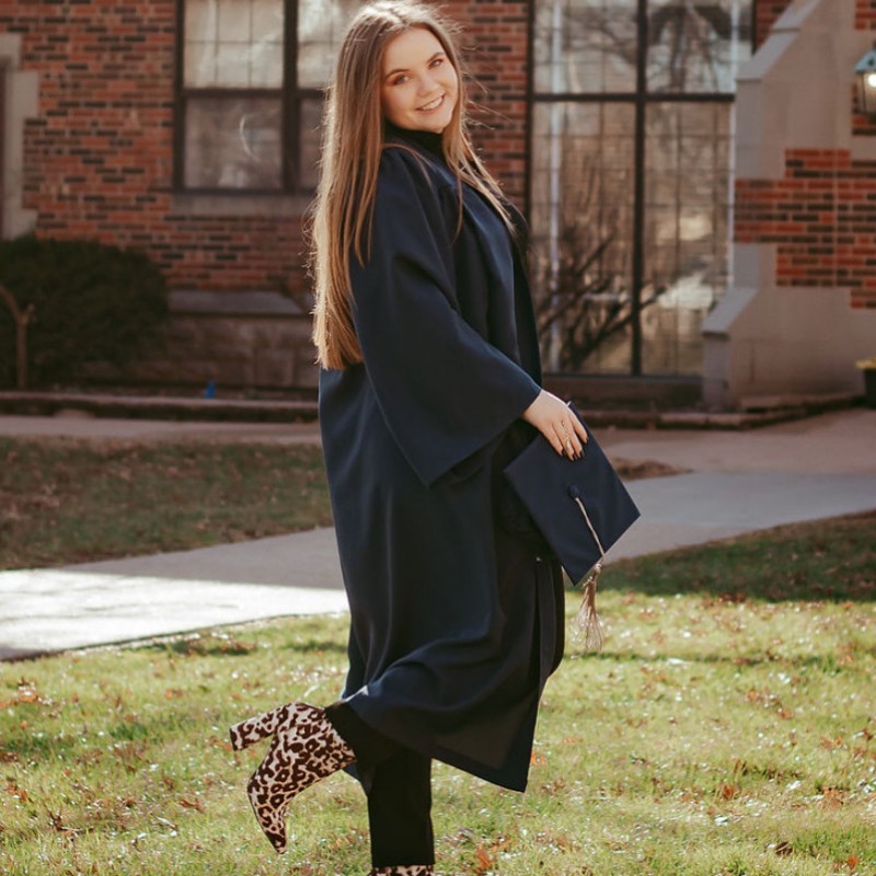 Portrait of Fallon in black cap and gown, looking over her shoulder and smiling