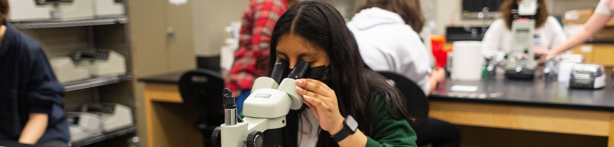 Female camper using a microscope to identify clues in the CSI: Columbia College summer camp.