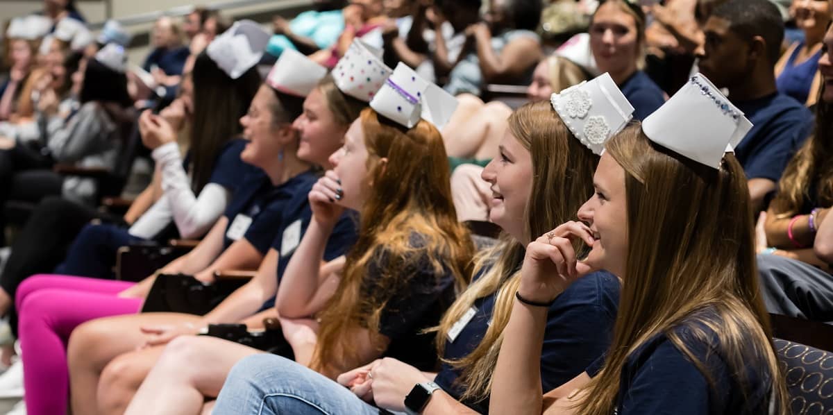 Group of nursing students sit in auditorium wearing their homemade nursing caps.