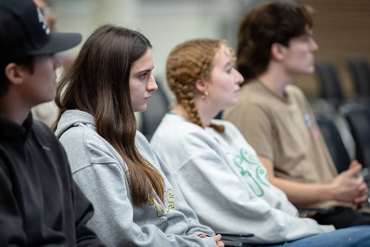 Four business students sitting in a hall, looking ahead toward a speaker.