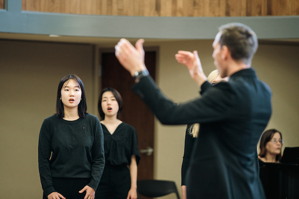 Several students and the choir leader, all dressed in black, rehearsing for the annual showcase.