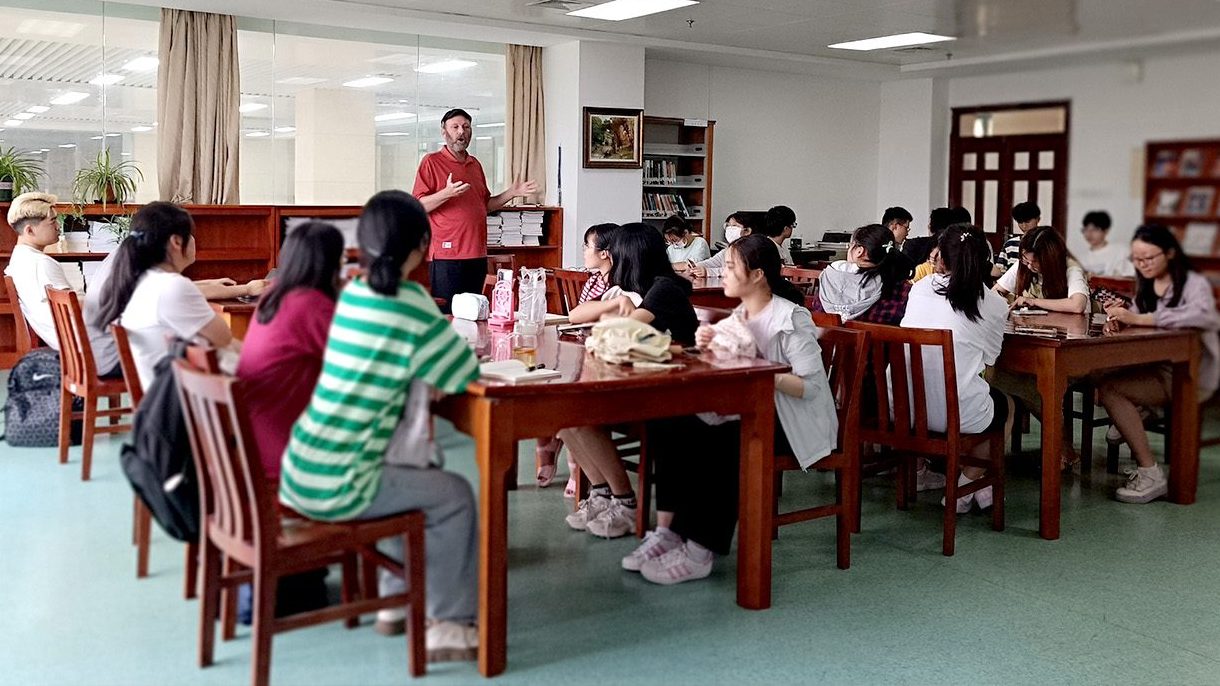Three students standing in front of a window, having a discussion.
