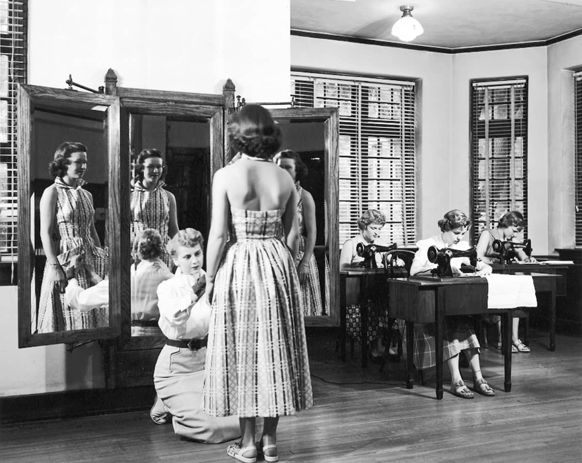 Historical image of a student kneeling, hemming the dress of a student who is standing in front of mirrors in a sewing class. Distant view of the Columbia College main campus red brick buildings, with a field of pink and yellow tulips in the foreground.