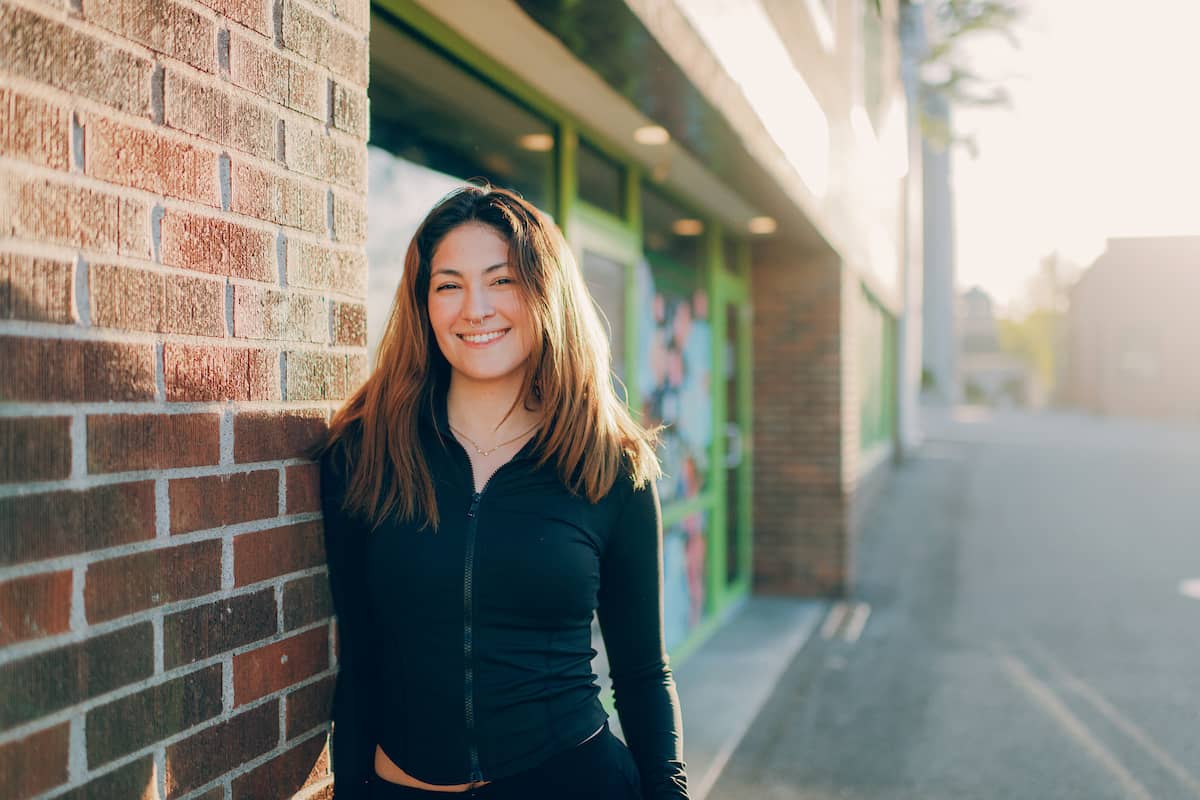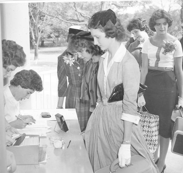 Historical image of women standing in a line, wearing dresses, hats and corsages, checking in at a table. Student with long brown hair, leaning against a brick wall and smiling at the camera.