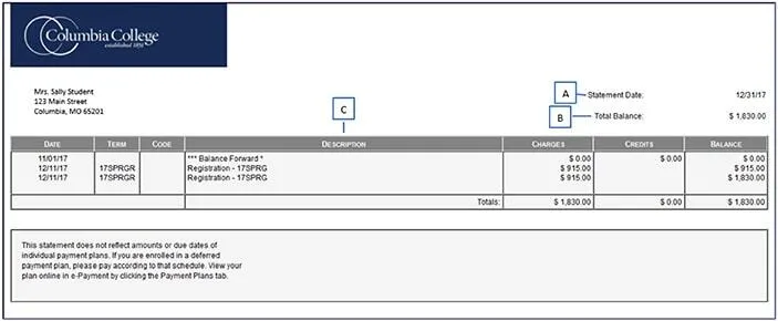 Statements are issued monthly to show students all account activity that has occurred for a specified period of time. The information listed below corresponds to the legend on the sample statement.