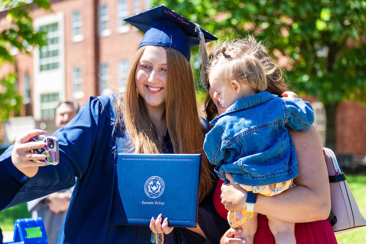 Picture of a female graduate in navy cap and gown, taking a selfie on her phone with a young child being held by another woman.